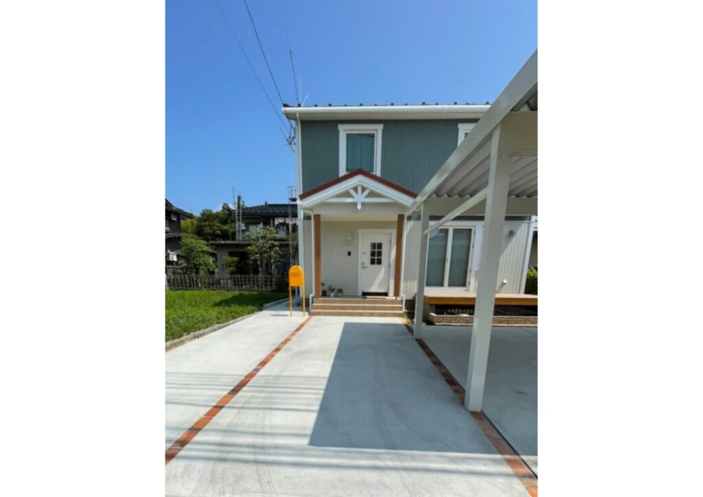 新築住宅に合わせて計画された外構は、シンプルな土間コンクリートをベースに、アクセントとしてレンガラインを配置しました。単調になりがちな駐車スペースに温かみのあるデザイン性を加え、帰宅時や来客時に心地よい印象を与えてくれます。