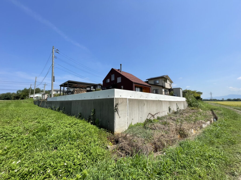 L型擁壁でしっかりと地盤を支えつつ、開放感のある景観を最大限に活かした外構です。