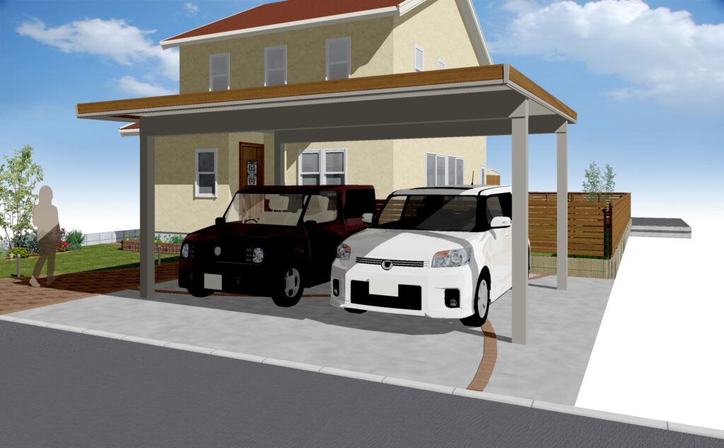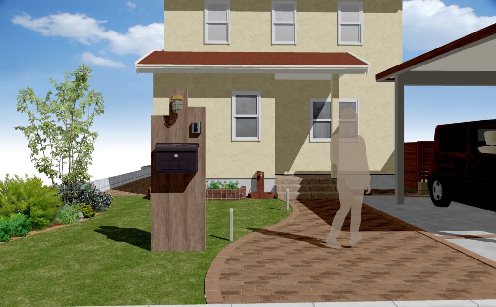 温かみのあるテラコッタ屋根に調和する、ナチュラルなドッグランのあるお庭です。アプローチにはレンガを敷き、カントリーな趣を演出。