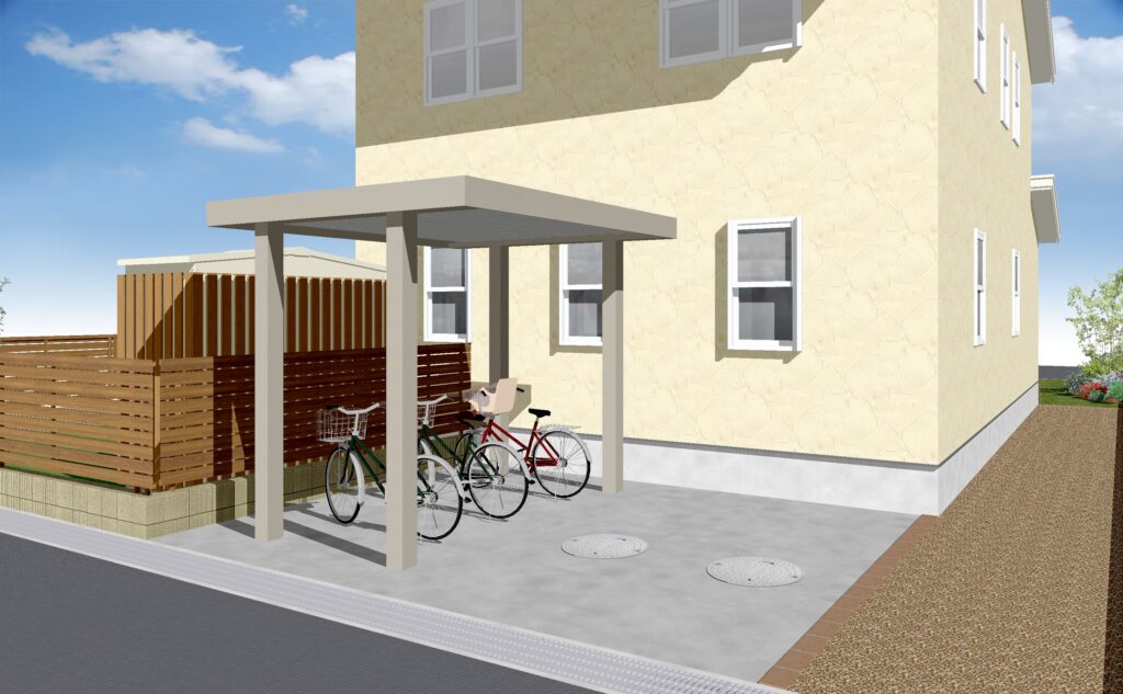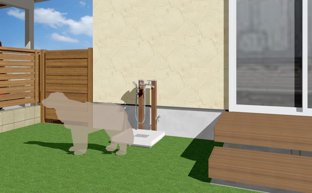 建物の裏手には広々とした人工芝のプライベートドッグランを完備しました。リビングから続くウッドデッキは、愛犬を見守る特等席。木調フェンスが視線を遮り、家族と愛犬が周囲を気にせずのびのびと過ごせる、機能的で温もりあふれる空間です。