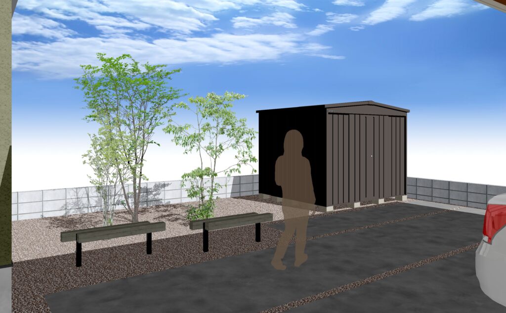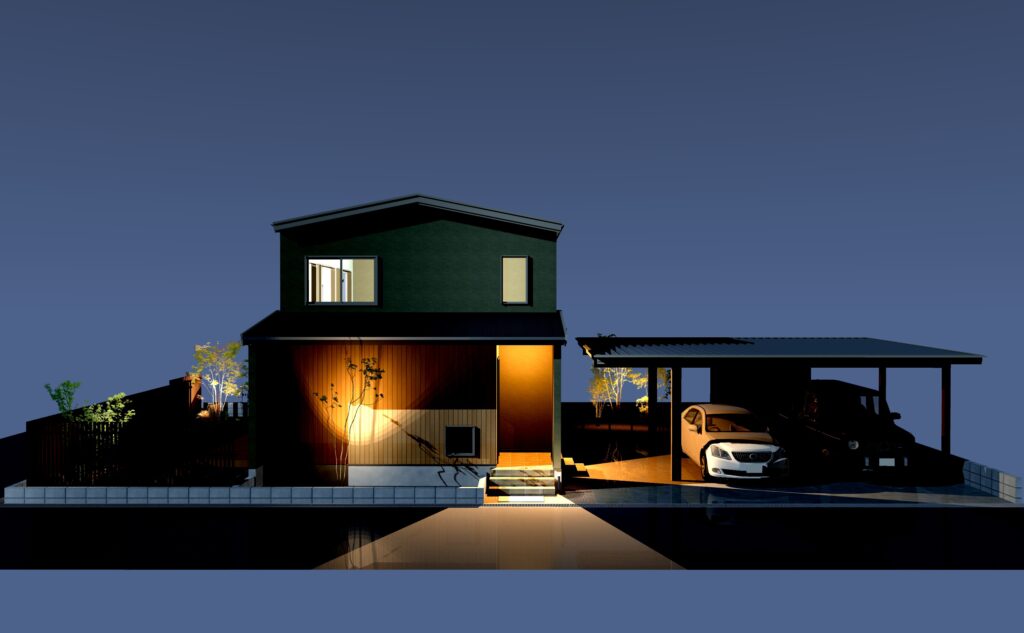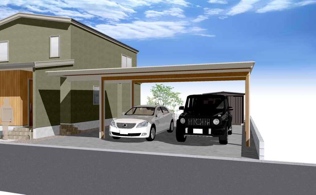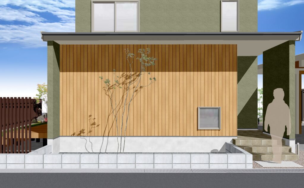 自然素材の温もりとスタイリッシュな機能性を両立させたプランです。最大の特徴は、カーポートの屋根を大胆に延長させたデザイン。空間に奥行と重厚感を生み出しつつ、雨の日の導線にも配慮し、車から玄関まで濡れずに移動することができます。