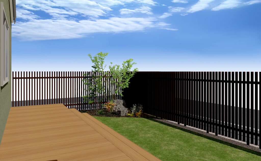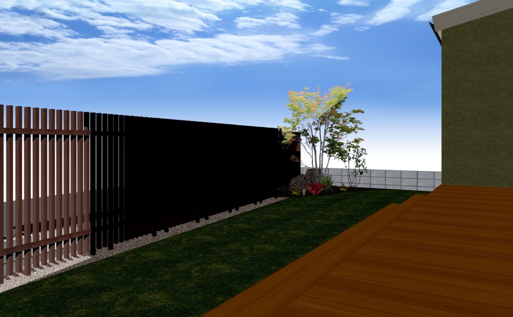 ウッドデッキを囲む縦格子フェンスは、光と風を通しながらプライバシーを確保。建物周りの樹木や下草は和の趣を感じさせます。